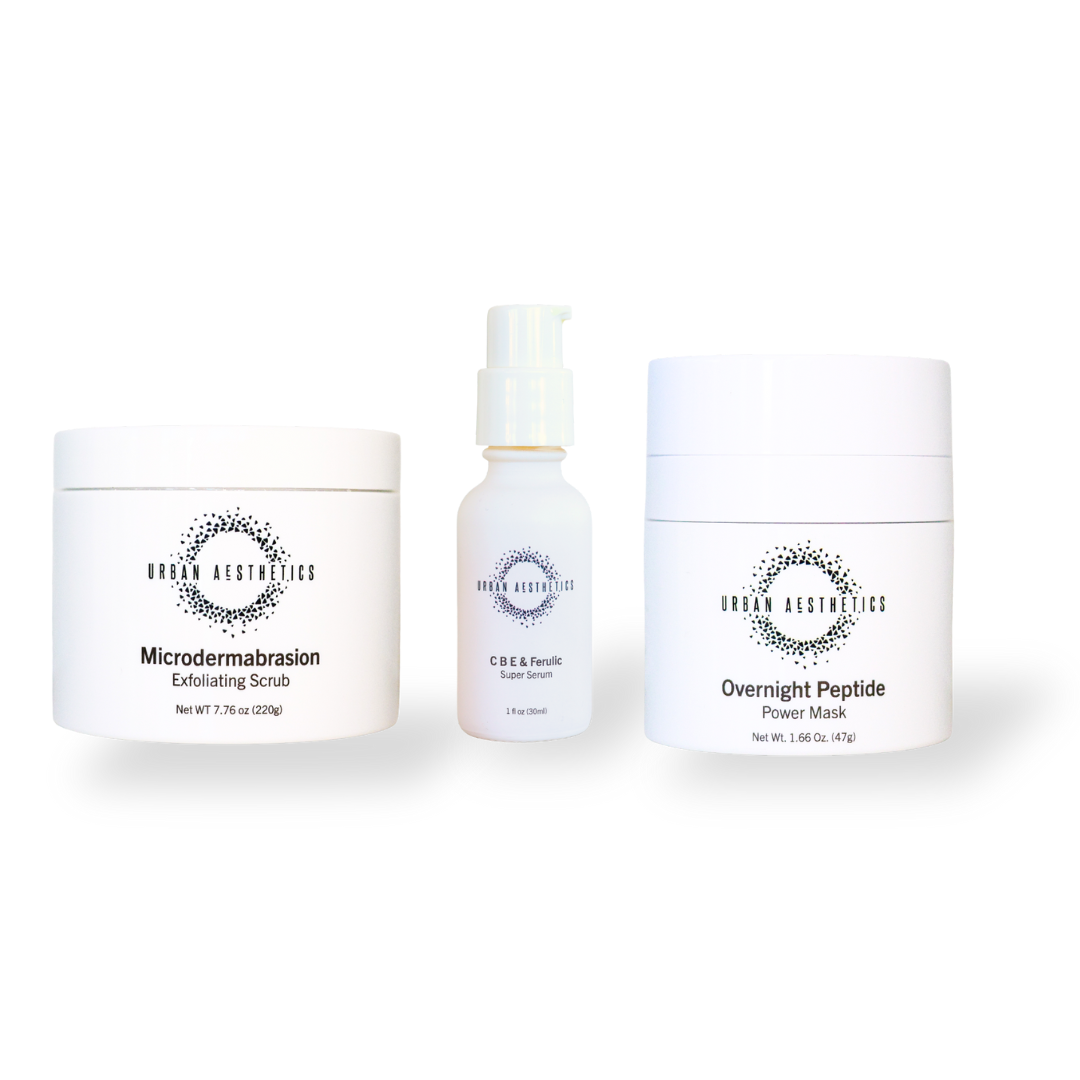 This kit features our exfoliating Microdermabrasion Scrub, antioxidant powerhouse C B E & Ferulic Serum, and restorative Overnight Peptide Power Mask for noticeable glow and renewal.